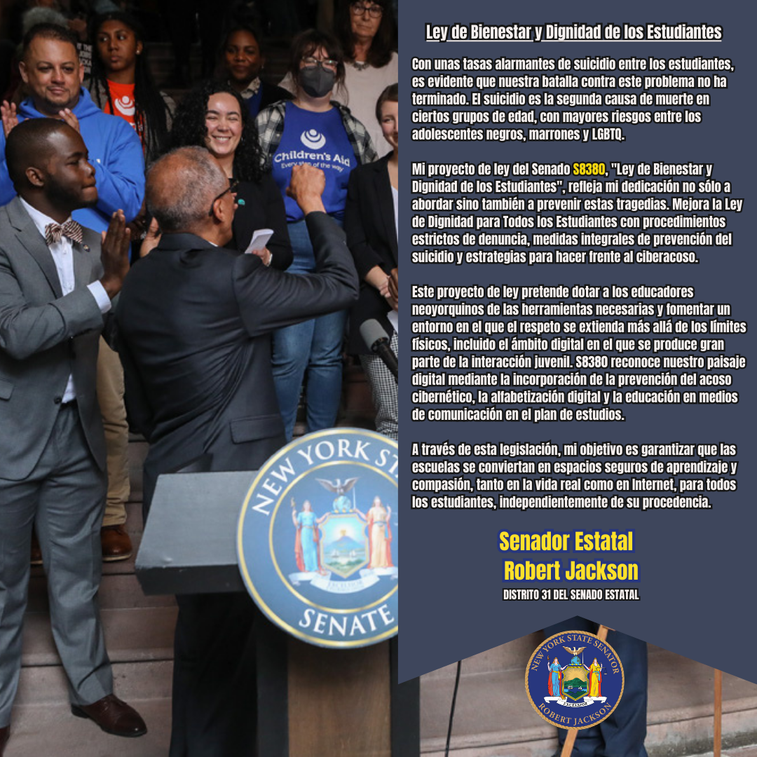 Esta semana, nos centramos en la "Ley de Bienestar y Dignidad de los Estudiantes", S8380, encendiendo un diálogo vital sobre el bienestar de nuestros estudiantes y fortaleciendo la Ley de Dignidad para Todos los Estudiantes.